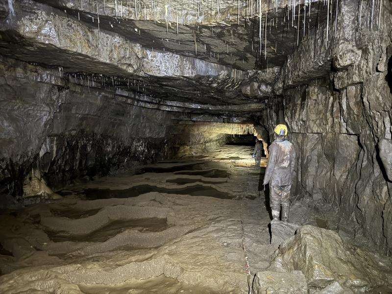 To get to our surveying destination, we had to trudge through a section of mud with the viscosity and texture of peanut butter, which clings to you, threatening to absorb you and drag you into its suffocating depths with an alarming amount of force, a kind of mud I’ve personally never experienced before, and I hope it subsides by next year. The passages we surveyed were remarkably dry compared to the wet sludge we’d travel through to arrive there - nice and manoeuvrable. Sean had never done any surveying before despite caving for four years, so it was really enjoyable to experience how enthusiastic he was about it. Something that's quite fun about surveying down long corridors is aligning the stations, so they can be the furthest distance apart while still being representative of the cave and its idiosyncrasies.