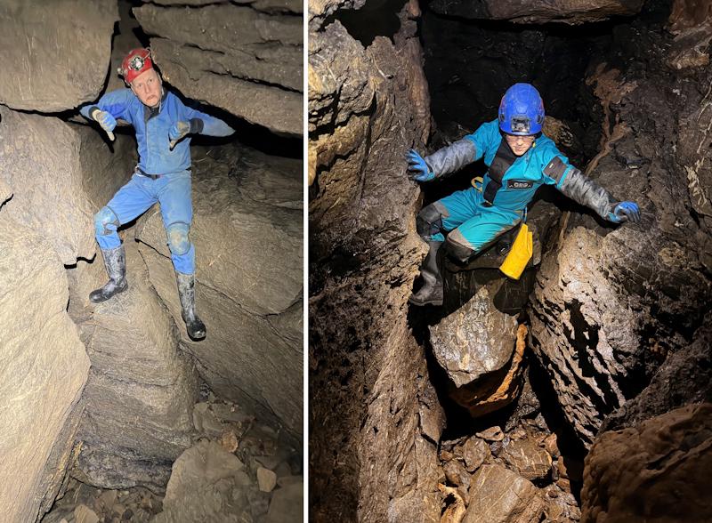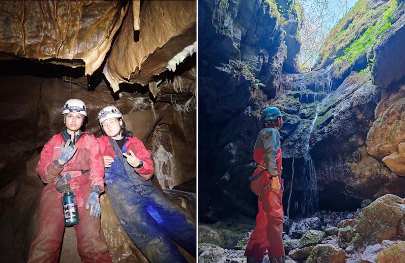Sponsorship photos: Left, Joshitha Sivakumar and Emily Wormleighton in Fairy Cave Quarry, photo by Jess Brock and right, Mowgli Palmer at Bull Pot of the Witches, photo by Joshitha Sivakumar.