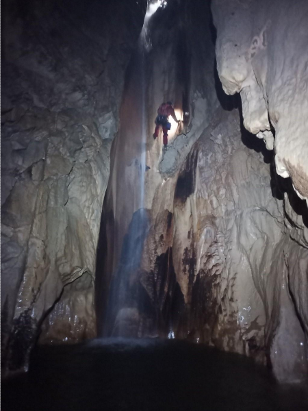 The morning would prove to be a carbon copy of many of the mornings, half the group waking up hungover, a group of four trying to convince everyone to bin off caving and go canyoning instead and everyone else discussing trip plans. Throughout the holiday, trips would consist of probing trips upstream from La Verna Showcave towards where we’d be popping out of the traverse, trips downstream from La Verna (technically down to –1300 metres, but with the same argument as OFD1 being –300 but the entrance is right there) and visits to the galleries around La Verna. Other caves frequently visited were caves such as Bexanka, a lovely, well decorated fossil cave, and Petite Bidouze, a very wet, very short but very pretty pull through trip, almost as if canyoning through a cave.