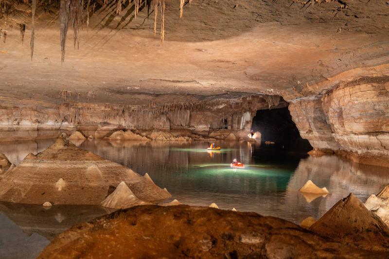 Lago do Cruzeiro - Buraco do Inferno da Lagoa do Cemitério. Licensed under the Creative Commons Attribution-Share Alike 4.0 International license.The landing site in question, and in fact the whole bank, was the base of a ginormous collapse pile that was covered in formations of all different kinds. At the top we could see huge globules of flowstone as we traced a path around the base that weaved between many stalagmites nicknamed 'candles' for their resemblance to melted wax. The far side of the pile transitioned from rubble to a large dry mud bank, from which we could look down at a vast muddy plain. Yes, a whole plain, inside a cave. Not a hundred meters from the bottom of the slope, we reached the banks of a river, and I do mean a river. Lucas explained that there were many resurgences inside the cave that formed tributaries that joined the main cave stream. We were now at the bank of one such tributary.