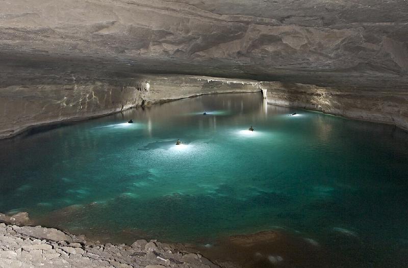 Lago do Cruzeiro - Buraco do Inferno da Lagoa do Cemitério. Licensed under the Creative Commons Attribution-Share Alike 4.0 International license.The landing site in question, and in fact the whole bank, was the base of a ginormous collapse pile that was covered in formations of all different kinds. At the top we could see huge globules of flowstone as we traced a path around the base that weaved between many stalagmites nicknamed 'candles' for their resemblance to melted wax. The far side of the pile transitioned from rubble to a large dry mud bank, from which we could look down at a vast muddy plain. Yes, a whole plain, inside a cave. Not a hundred meters from the bottom of the slope, we reached the banks of a river, and I do mean a river. Lucas explained that there were many resurgences inside the cave that formed tributaries that joined the main cave stream. We were now at the bank of one such tributary.