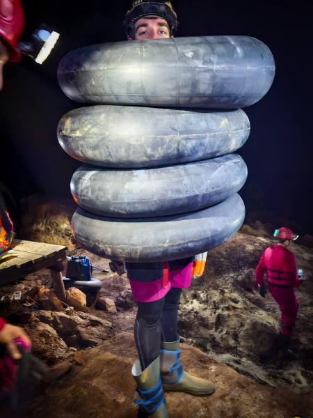 While I was taking it all in, all about me a scene unfolded that would have been recognisable to anyone on the south coast of England in the months running up to June 6th 1944, only in microcosm. An amphibious landing was being prepared, albeit with the usual caver chaos and faff. Everyone had a life jacket and a car inner tyre which had to be inflated before the embarkation could begin. What few foot pumps we had were being passed around to inflate the inner tubes, which was a two person job as the pump-pipes needed to be held around the valve opening while the hard work was done.