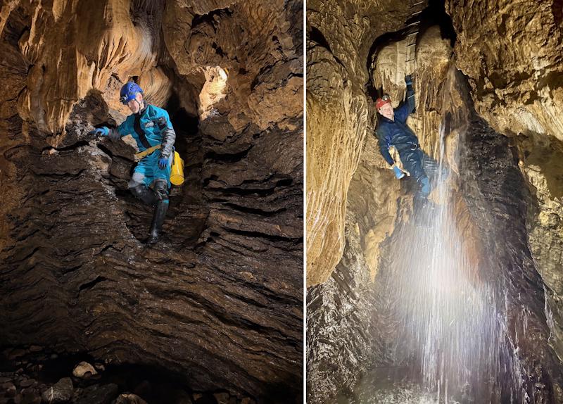 Sponsorship photos: Left, Joshitha Sivakumar and Emily Wormleighton in Fairy Cave Quarry, photo by Jess Brock and right, Mowgli Palmer at Bull Pot of the Witches, photo by Joshitha Sivakumar.