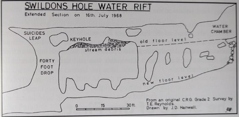In the early 1950s, the pot was deemed to be not much of a lead as it was 12m deep and only 23m above sea level. So it was felt there was unlikely to be much open passage downstream and that any upstream route would also be barred after a short distance as it would have to pass under the River Aille where this was running on limestone.